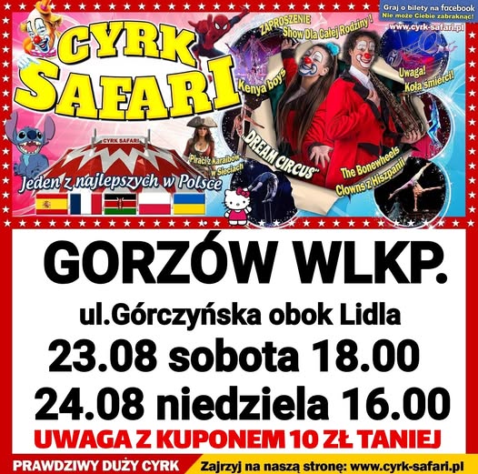 Mamy dla Was cztery podwójne bilety! Jeśli chcesz je otrzymać, to wyślij do nas maila na adres: konkurs@gorzow.news w piątek, tj. 22 sierpnia 2025 r. punktualnie o godz. 17:00 (maile nadesłane przed godz. 17:00 nie będą brane pod uwagę). W tytule wpisz: Cyrk Safari. W wiadomości wpisz imię i nazwisko. Nagrodzimy najszybsze cztery osoby, które wyśle maila. Zwycięzców poinformujemy mailowo.