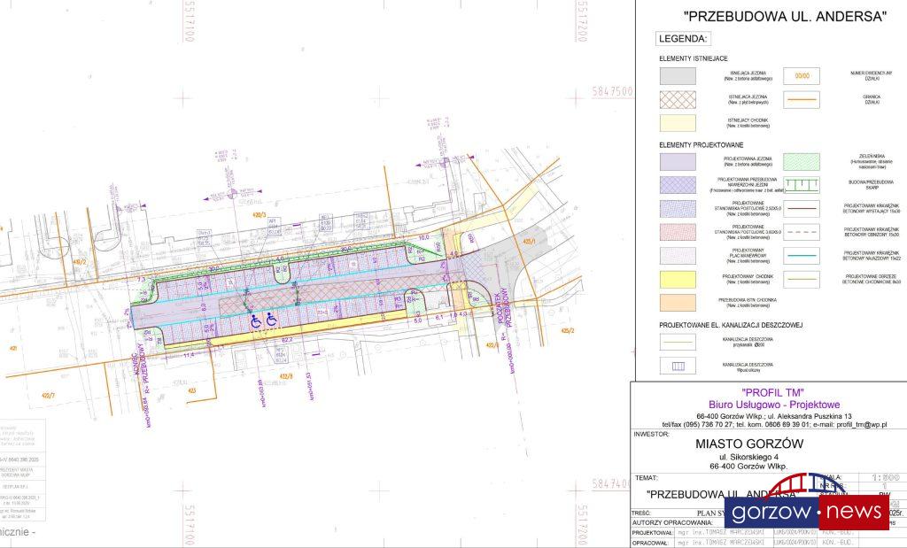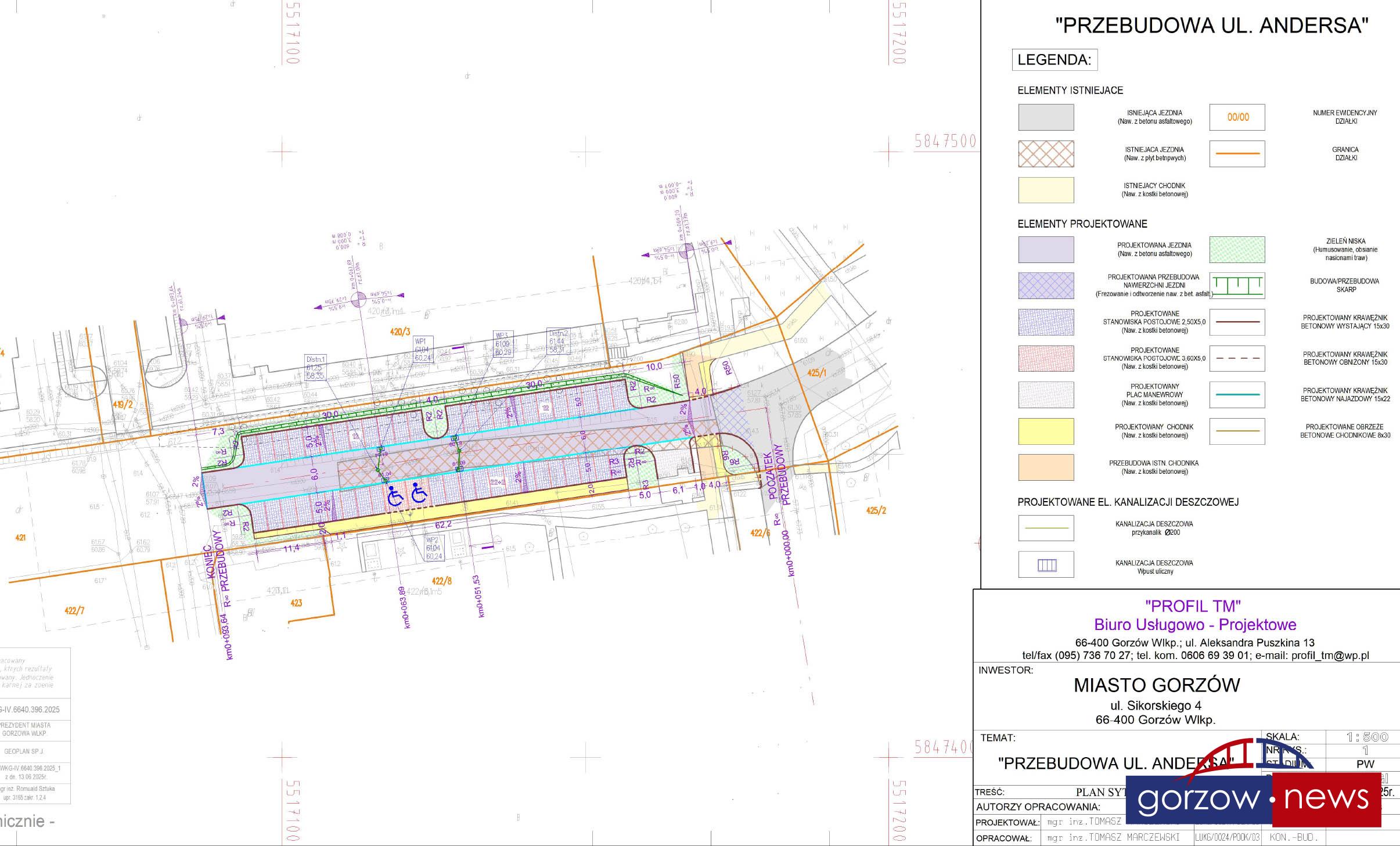 Miasto ogłosiło postępowanie pod nazwą: „Przebudowa ul. Andersa w Gorzowie Wlkp.” i czeka do 8 października na oferty firm. Prace dotyczyć będą odcinka o łącznej długości około 93,64 m od skrzyżowania z ul. Pluty. Sprawdziliśmy, co dokładnie w ramach zadania ma zostać wykonane.
