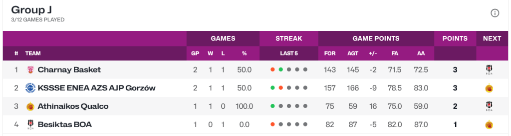 Charnay Basket: Sara Chevaugeon 22 (4×3), Shakayla Thomas 15 (6 zb.), Mariama Daramy 5 (1×3, 3 zb., 3 as.), Claire Dalstra 4 i Coralie Chabrier 3 (3 as.), oraz Maye Toure 11 (1×3), Binta Drame 10 (4 zb.), Nukiya Mayo 9 (1×3, 6 zb.) i Stella Colas 5 (1×3, 9 as.).