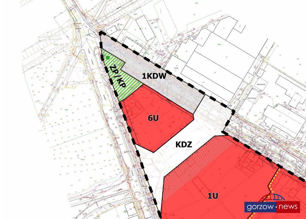 Wjazd na działkę i do przyszłego parku handlowego ustalono od ul. Kobylogórskiej i zaznaczono na mapie poniżej symbolem 1KDW.