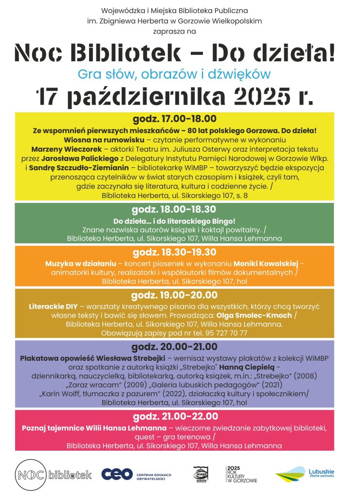 Wojewódzka i Miejska Biblioteka Publiczna w Gorzowie przygotowała na piątek, tj. 17 października 2025 r. wyjątkowy wieczór pełen literackich i artystycznych wrażeń. W tym roku hasło ogólnopolskiej akcji brzmi „Do dzieła!”, a gorzowska książnica postanowiła potraktować je dosłownie – łącząc literaturę z działaniem twórczym, sceną, muzyką i sztuką.