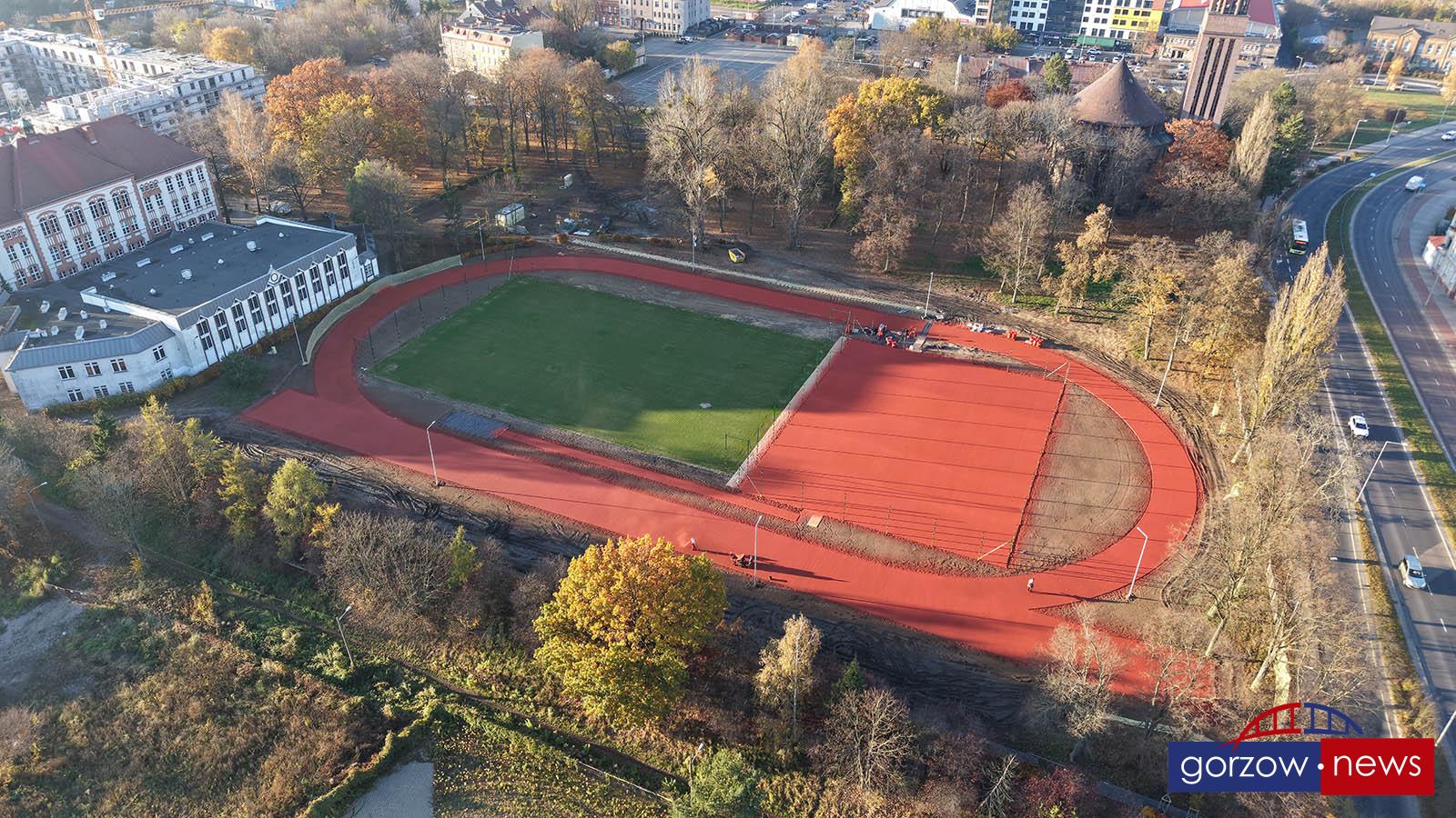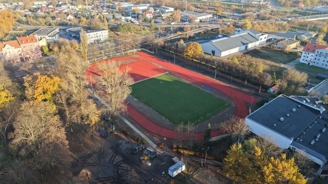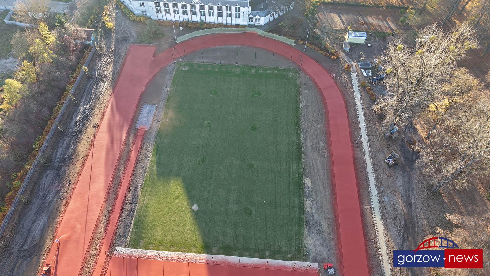 Wykonawca rozpoczął układanie ostatniej, natryskowej warstwy nawierzchni na boisku wielofunkcyjnym, bieżniach oraz skoczni w dal. Zakończono prace przy systemie nawadniania boiska trawiastego, na którym pojawiła się już piękna, zielona trawa. Gotowe jest również oświetlenie terenu, które umożliwi korzystanie z obiektu także po zmroku. Przed wykonawcą ostatni etap inwestycji – montaż piłkochwytów, bramek, słupków, porządkowanie terenu oraz zasiew trawy wokół boiska.
