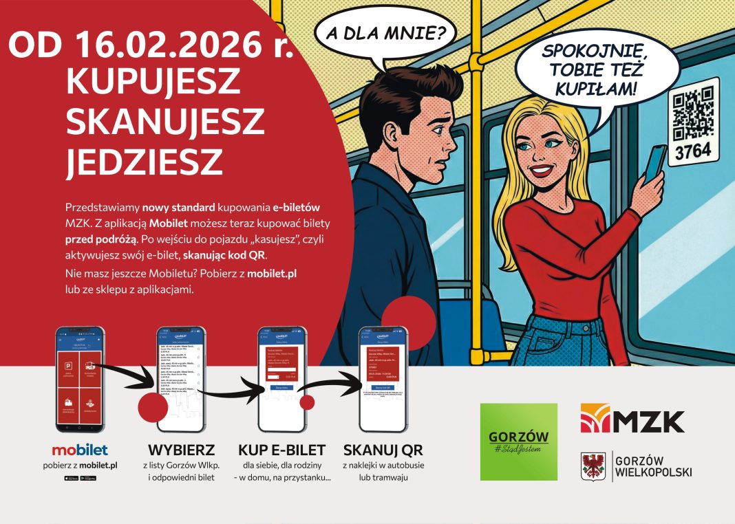 Nowości w gorzowskim MZK: kody QR i komiksowa rewolucja. Od dziś w gorzowskich autobusach, tramwajach oraz we wiatach przystankowych pojawią się kolorowe plakaty zapowiadające nową kampanię informacyjną. To przygotowanie do ważnej zmiany, która wejdzie w życie 16 lutego 2026 roku i odmieni sposób, w jaki korzystamy z biletów elektronicznych.