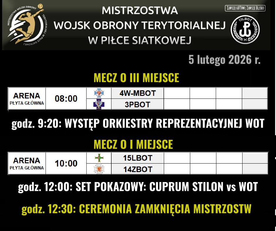 Podczas finałowego dnia kibice będą mogli nie tylko śledzić decydujące spotkania turnieju, ale również usłyszeć na żywo Orkiestrę Reprezentacyjną WOT oraz zobaczyć wyjątkowy set pokazowy, w którym żołnierze-sportowcy zmierzą się z zawodnikami Cuprum Stilon Gorzów. Wstęp wolny.