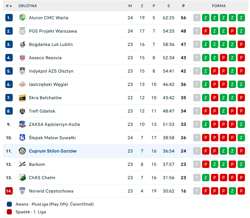 W spotkaniu 25. kolejki PlusLigi Cuprum Stilon Gorzów przegrał w Zawierciu z Aluronem CMC Wartą 1:3. Gorzowianie nawiązali walkę, urwali seta liderowi, ale Jurajscy Rycerze zgarnęli komplet punktów.