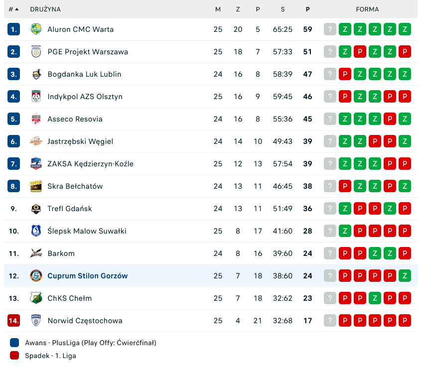 Cuprum Stilonem Gorzów przegrał w ostatnim ligowym spotkaniu PlusLigi w sezonie 2025/2026 w Arenie Gorzów z ZAKSą Kędzierzyn-Koźle 1:3 w ramach zaległego spotkania 23. kolejki PlusLigi. W trzecim secie doszło do niesamowitej końcówki. Goście prowadzili już 16:11 oraz 22:18, ale konieczna była gra na przewagi, która zakończyła się rezultatem… 41:39!